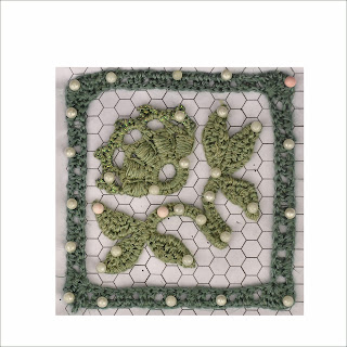 On this stage I crocheted a bud and two leaf branches, I place all stuff face down into the square made and pined it down.